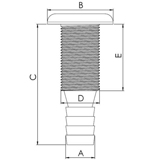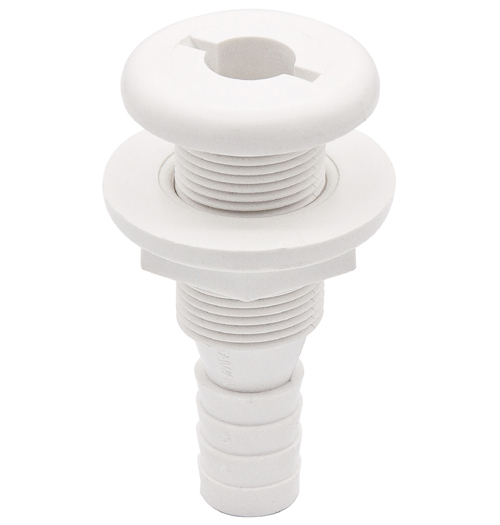Borddurchlass mit 3/4″-Schlauchanschluss aus weißem Kunststoff mit weißer Abdeckung zur Verwendung über der Wasserlinie.